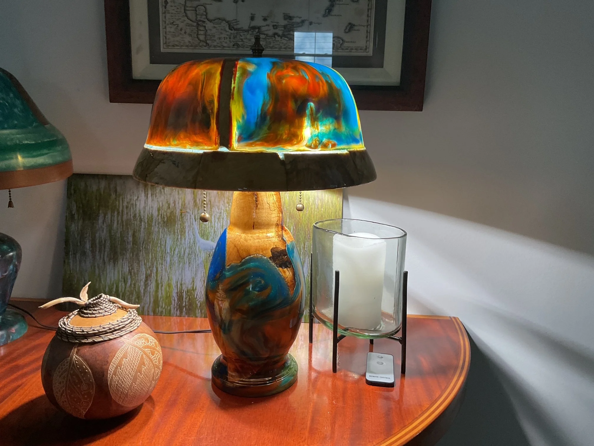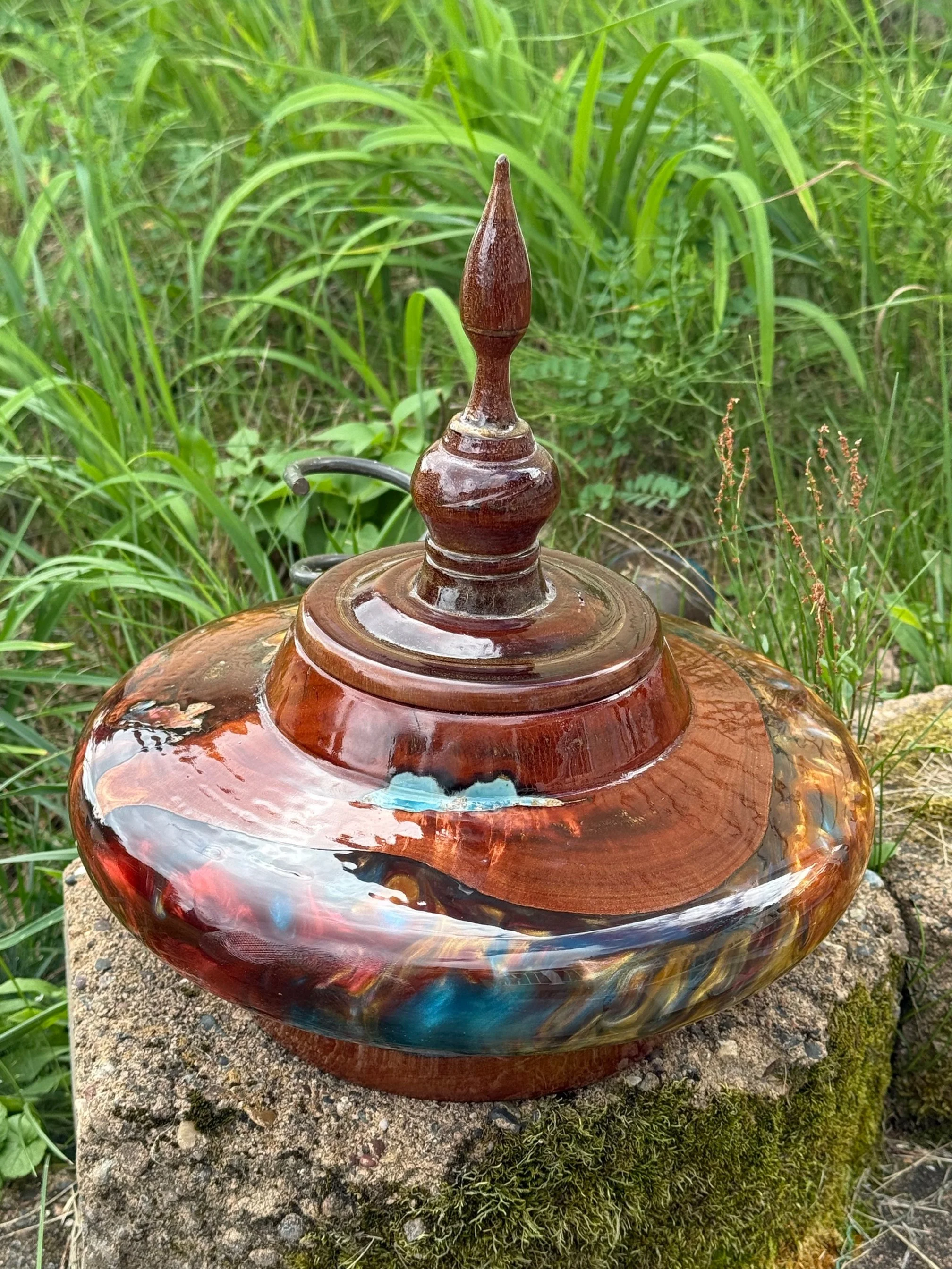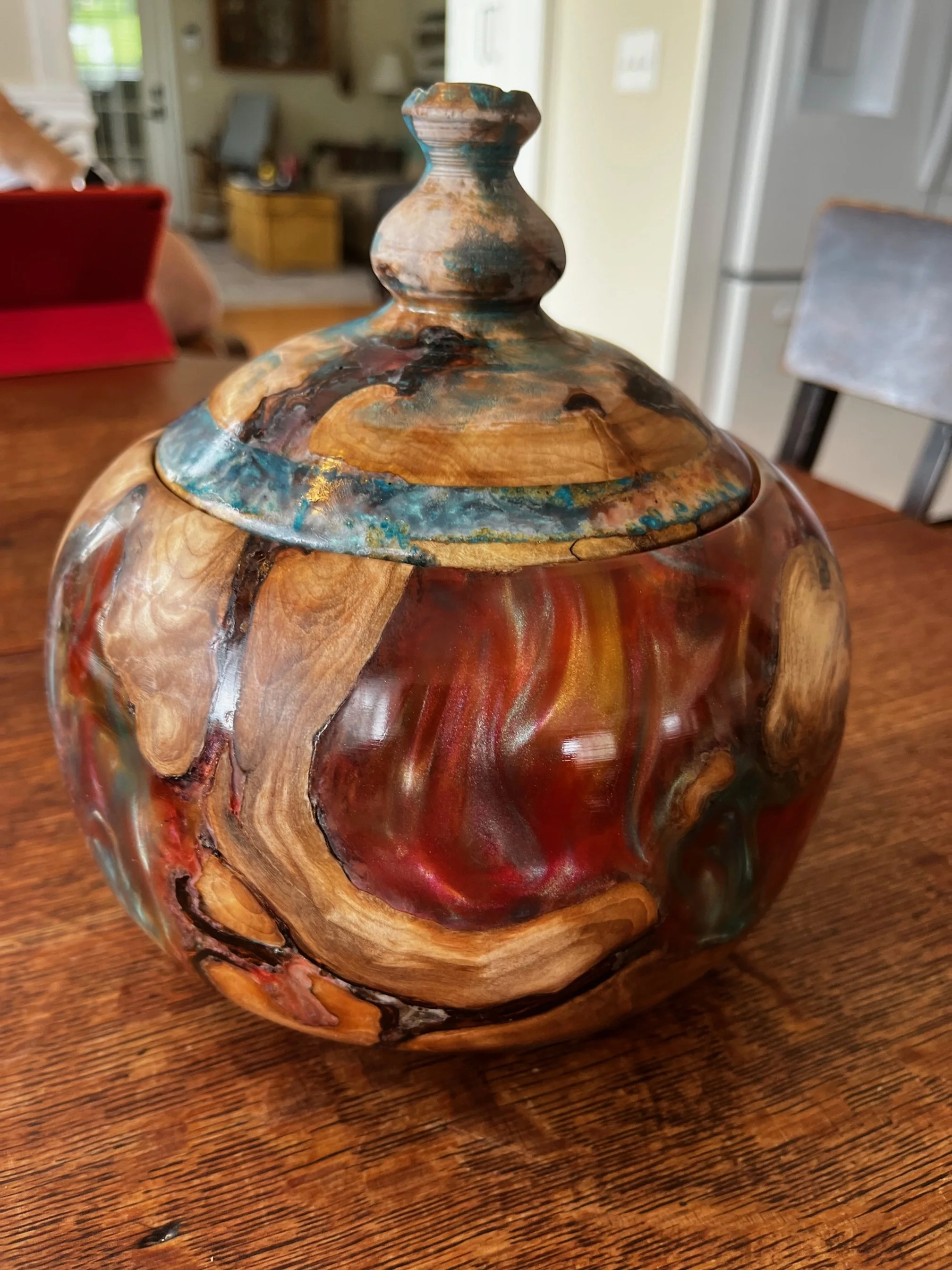 As an artist and craftsman, he wanted a more creative approach to hand turning, so he started looked at combining pigmented resin with woodturning.