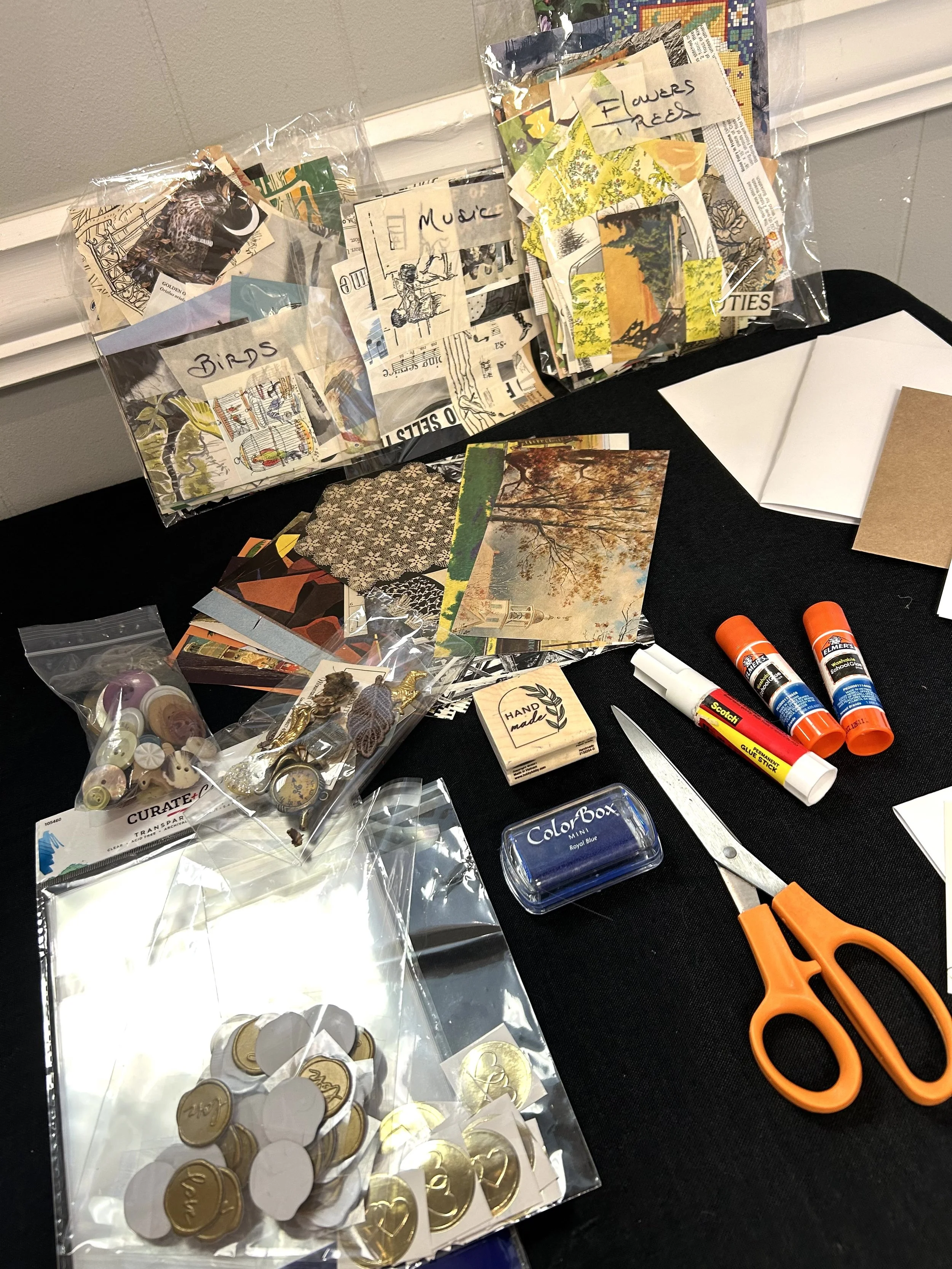 This two hour workshop includes all the materials that you’ll need including a baker’s dozen set of blank cards and envelopes in both (A7 and A2 sizes); glue sticks, assorted ephemera clippings and photos from old books and magazines, colored pencils, envelope seals and transparent sleeves in which to place your handmade card sets. You are also welcome to bring any of your own favorite ephemera to work with (example: photos, postcards, maps, sheet music, old stamps, flat buttons, stickers, etc.)
